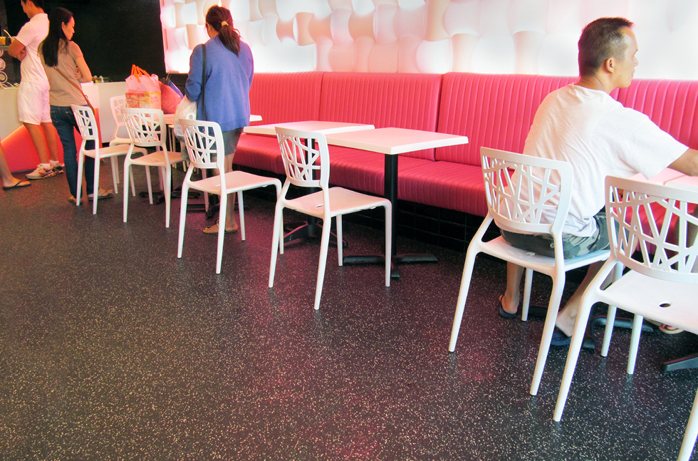 Flowcrete Australia's popular Flowcoat Terrosso system was chosen in a creative mix of pink and black shades for the 60 square metre shop front and dining area. An epoxy resin system that offers clients the appearance of seamless terrazzo, Flowcoat Terrosso is a popular choice in commercial leisure facilities offering an attractive floor finish combined with excellent wear, chemical and scratch resistance.
