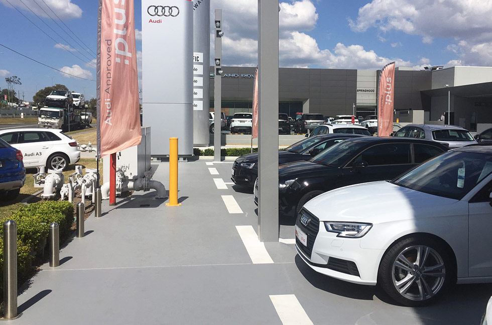 Acting as the backdrop to the luxury vehicles on display as well as being the first impression for many arriving customers, the car park needs to present an unblemished, attractive surface. The centre’s operators knew that the existing concrete substrate required a flexible trafficable membrane system to both protect the concrete and provide key operational properties that would reflect the site’s high-end identity.