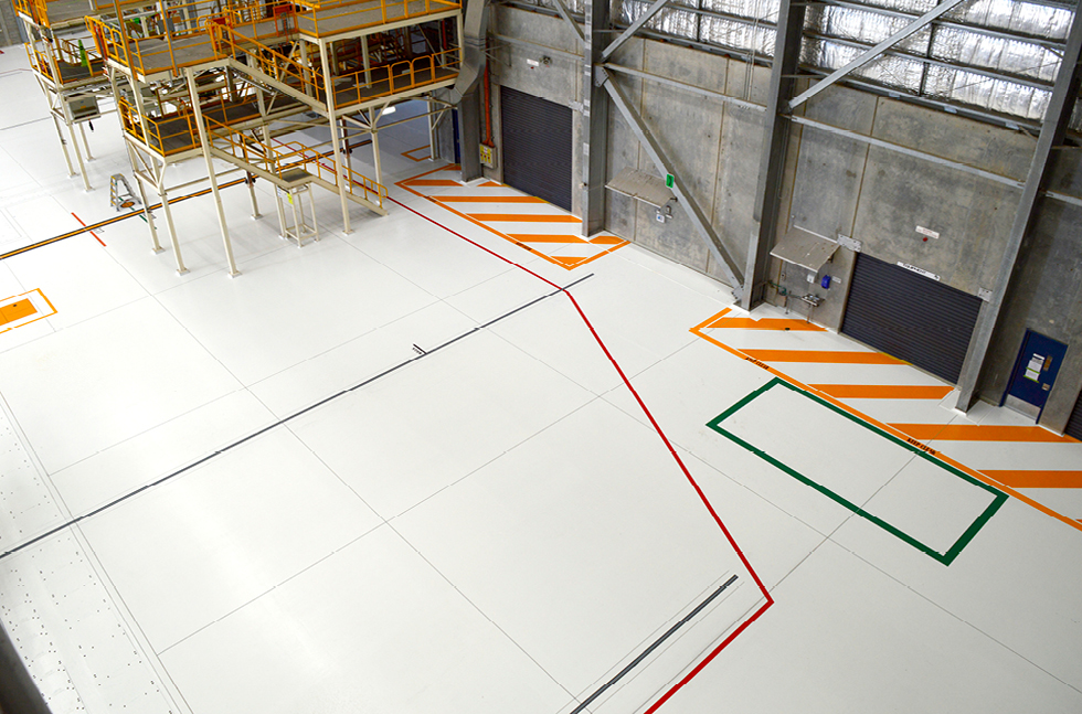 Line marking was later applied in contrasting shades of yellow, red and green to denote working zones and regulate traffic movement within the Aircraft Maintenance Facility.