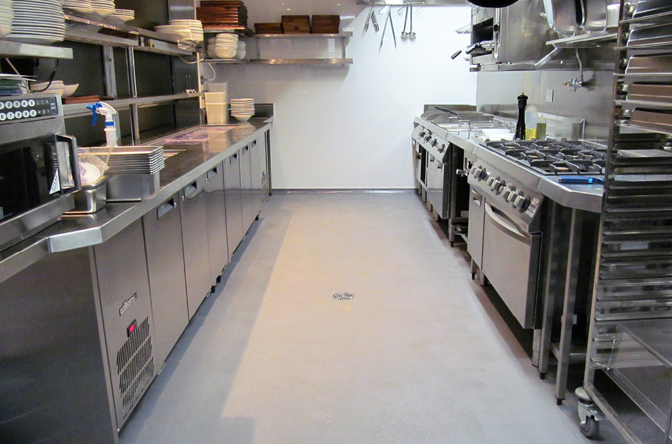 Flowtex F1 Repair Mortar from Flowcrete was also used in the kitchen and behind the bar to level and correct the existing slab as well as to create falls to drains and prevent the pooling of water in these areas.