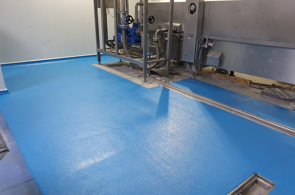 300m2 of the HACCP Internationally certified Flowfresh SR 4-6mm system was installed in the food manufacturing areas to provide resilience to chemicals, durability and superior strength. The request to have consistency across the facility required a vibrant Sky Blue (RAL 7015) custom colour to be applied to the manufacturing floor.