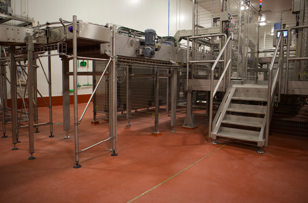 To address these complex requirements, a dual-system approach was specified to cater to different functional areas. For the 3,300 m² main processing and production zones, Flowfresh SR at a 6 mm thickness was selected. This system is renowned for its performance in meat processing environments, offering superior resistance to moisture and chemicals while providing a seamless, non-porous finish essential for hygiene compliance. In contrast, the non-processing areas, covering 700 m² of changing rooms, offices, and labs, were fitted with Terrosso flooring. This choice provided a durable, easy-to-clean surface with an enhanced aesthetic better suited for staff environments.