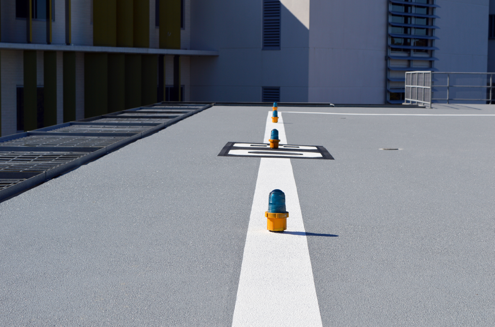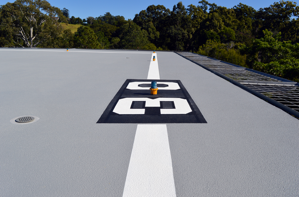 Deckshield ID in a grey shade, incorporating bright demarcation and signage was selected to protect the helipad.