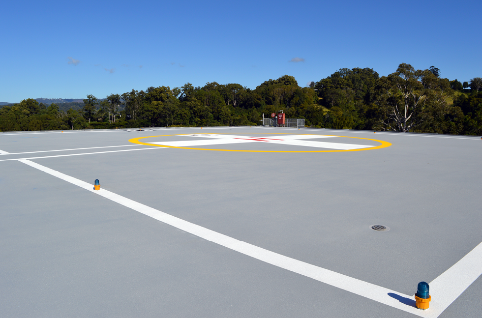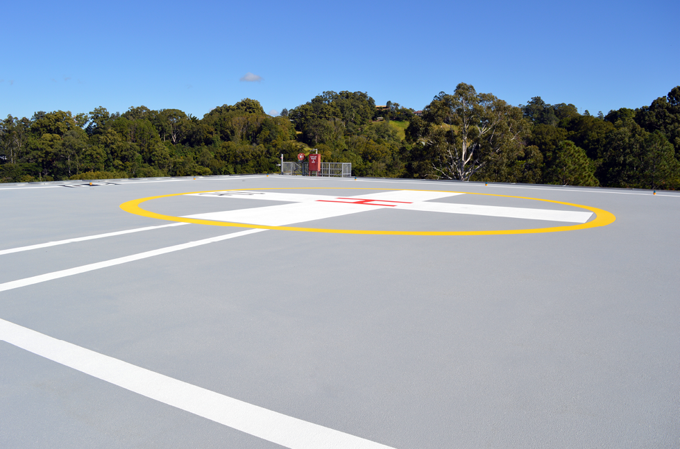 1,500 m2 of Flowcrete’s Deckshield ID polyurethane deck coating system have been installed on the roof-level helipad at Nambour General Hospital as part of a wider multi million-dollar Government funded refurbishment project.