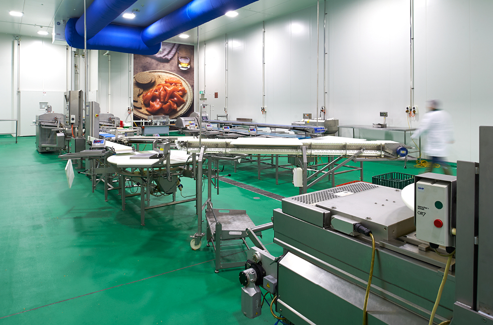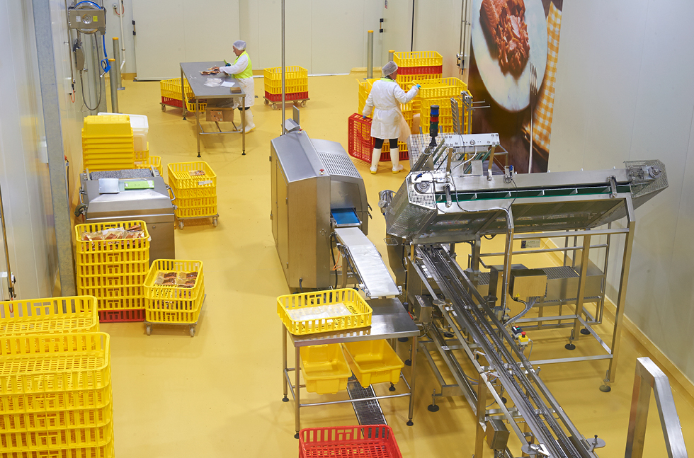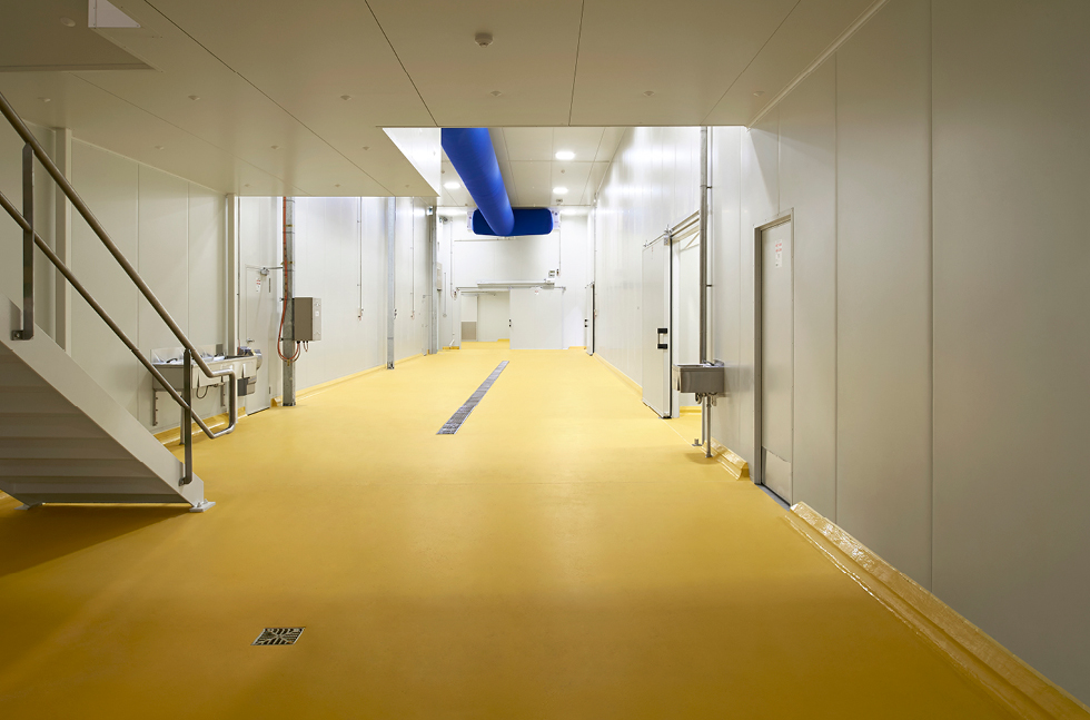 A 6mm layer of Flowfresh SR was applied in the smokehouse’s main processing areas, with stainless steel drainage incorporated into the finish. Different colours designate each area of the site to aid navigation and reduce cross contamination. A Signal Green floor was installed in the Cold Smoke Slicing room and Warm Buff was used for the Hot Smoke Slicing room.