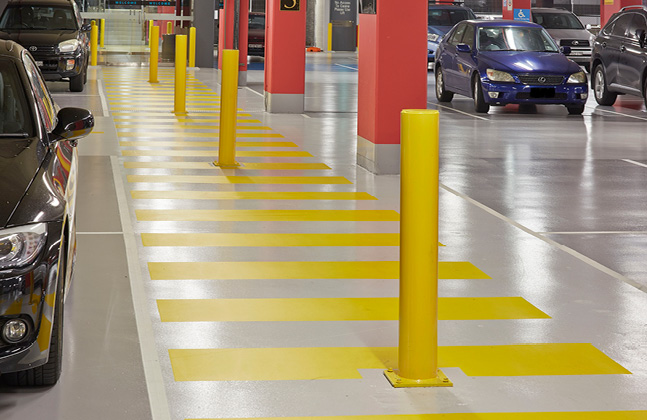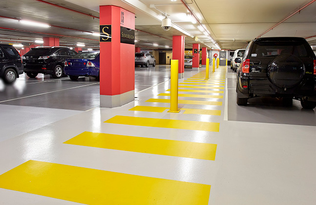 Two shades of grey were used to define the parking bays and driveways throughout the parking facility while harbour blue marked out the disabled spaces. Clear pathways were created around the car park by applying contrasting yellow and white line markings, which would help patrons to safely navigate around the building. All the line marking and hatching, including the disabled bays, was completed to the Australian Standard AS/NZS 2890.6-2009.